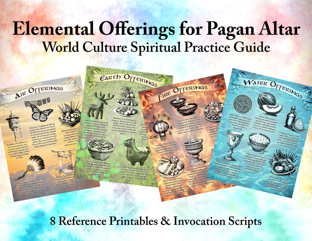 Call the elemental spirits to your aid! In pagan practice, it is customary to leave gifts or offerings when invoking the assistance of guides. Learn about traditional offerings from cultures around the world, the ways they worked with ancestors, nature spirits, and divine forces to attune themselves with the elements of life. Includes 4 full color detailed visual aids with examples. Please note: this research is to guide and inform you in exploring your own practice, not to fully represent the culture! The goal is not to copy or imitate for the purpose of mere emulation, but to take inspiration from their intentions and the types of tools they used to do their work. Also included are black and white printable intention sheets to invoke the power of each element, which are suitable for both personal practice and easy to recite scripts for ritual/group worship. More information about the elementals can been found on our website,